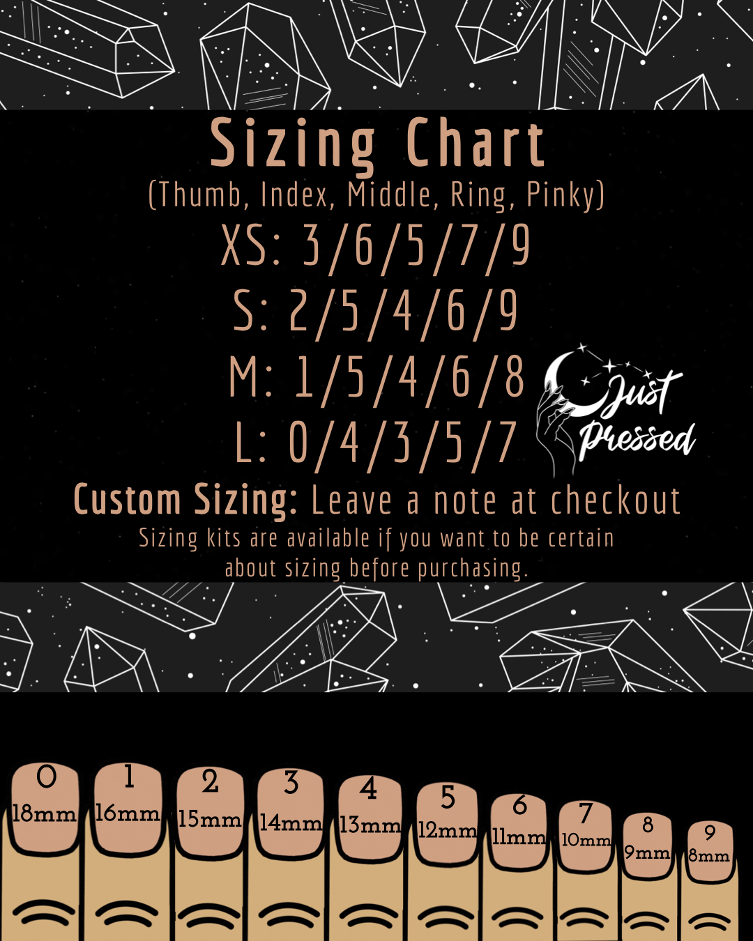 TIP: If you're stuck between sizes go with the larger size. Just Pressed Nails can be filed and shaped to fit your nails depending on the design, once they're received.